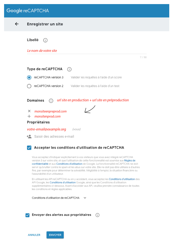 En étant connecté à votre compte Google, il vous faut générer une clé du site et une clé secrète en suivant ces instructions :
