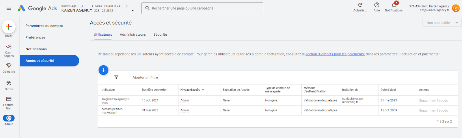 À noter que les clients doivent être en lecture seule. Ils ne doivent pas apportés de modifications au compte Google Ads lors de notre contrat.